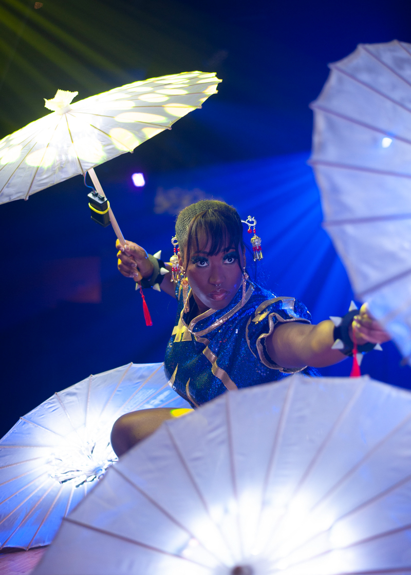 In the Starlets Division, it proved to be a “Canadian Invasion” — Vancouver, specifically — as two Canucks placed in the top three. Rachel Rampage’s “Horny Housewife” was a clever play on her tall, tattooed and taut physique, while she effectively utilized a shadow screen that awed the crowd. Lauren Lotus, the Starlet Division’s First Runner-Up, really got things heated up with her “Barbie Gone Naughty” show. With fire torches and bright LED fans, Lauren had an unmistakable presence on the stage. Ciara, the Second Runner-Up, brought the cold of her Canadian home to her “Ice Queen” show. Though the songs and the stage reflected the cold, Ciara got things fired up as well with her impressive aerial hoop work and her own fiery stage display.