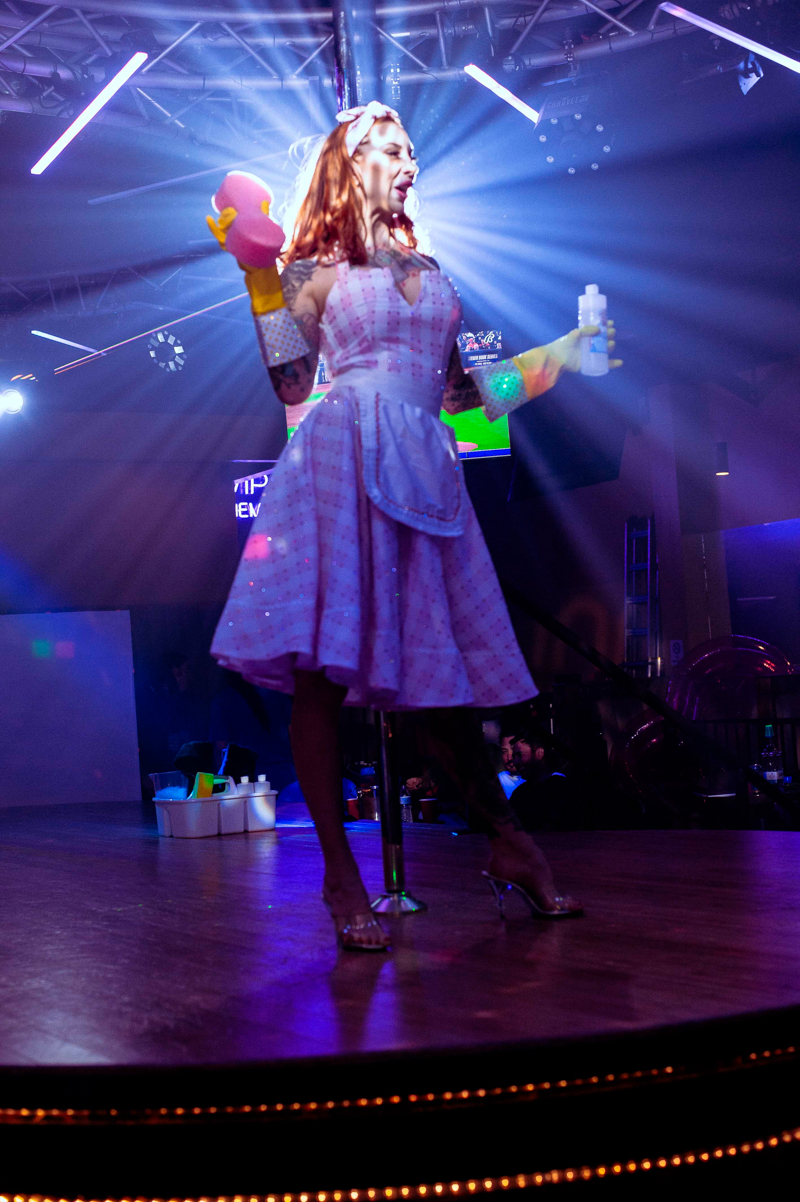 Autumn easily won the crowd over with her stunning athleticism and fluid movements. Her “Cleopatra” show included an aerial hoop display that was on-par with any EDI performance in the event’s 10-year history. Justice brought the flavor of Texas to her “Cowgirl” show which surely had everyone thinking, “Yee Haw!” She even created a custom “saddle” to accompany her aerial hoop performance, as Justice once again proved to be both creative and innovative with her show production. Michelle Lynn stepped outside of her typical show themes — and even wore a blonde wig — for her hilarious “Baywatch” show. The perky, bubble-booty’d Nova Baby, a competitor from the EDI West’s Starlet Division, helped launch beach balls while Charlotte Autumn, a competitor in the upcoming EDI East’s Starlet Division, stalked Michelle in her shark costume. But all’s well that ends well, as Michelle dove into the safety of her inflatable pool.